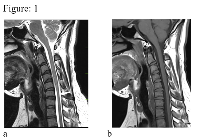 Figure: 1 (a & b). Sagittal T2 & T1 images in neutral position reveal localized cord atrophy (white arrow). No demonstrable dural displacement is seen.