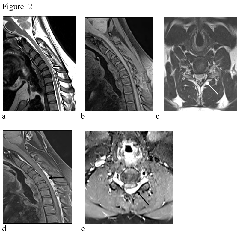 Figure: 2. T1 & T2 weighted images in flexion in sagittal (a, b) & axial (c) reveals anterior displacement of the dura (white block arrow) causing compression of the cervical cord. There is widening of the spino-dural space with prominent epidural veins (white arrow). The cervical cord shows atrophy. Sagittal & axial post contrast images in flexion (d, e) shows thick heterogeneously enhancing component in the epidural space (black arrow). There is also extension of the enhancing epidural lesion to the upper dosral region.