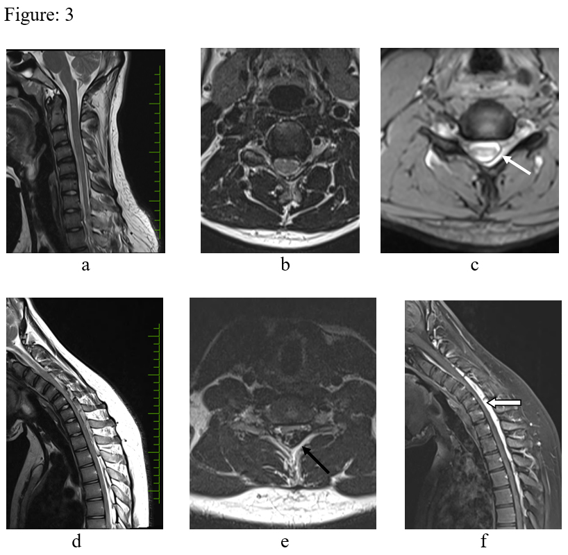 Figure: 3 – T2 sagittal (a) T2 axial (b), medic axial (c) in neutral position. There is focal cord atrophy, asymmetrical cord flattening & loss of attachment of the dura with lamina (white arrow). d, e & f – Flexion study (d, e – T2 sagittal & axial, f post contrast T2 sagittal) – There is anterior displacement of the dural sac, widened lamino-dural space with venous engorgement (black arrow) and epidural enhancing component (block arrow).
